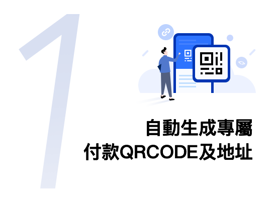 透過第三⽅加密⽀付系統平台,掃描QR Code,⽤⼾即可完成虛擬貨幣⽀付!